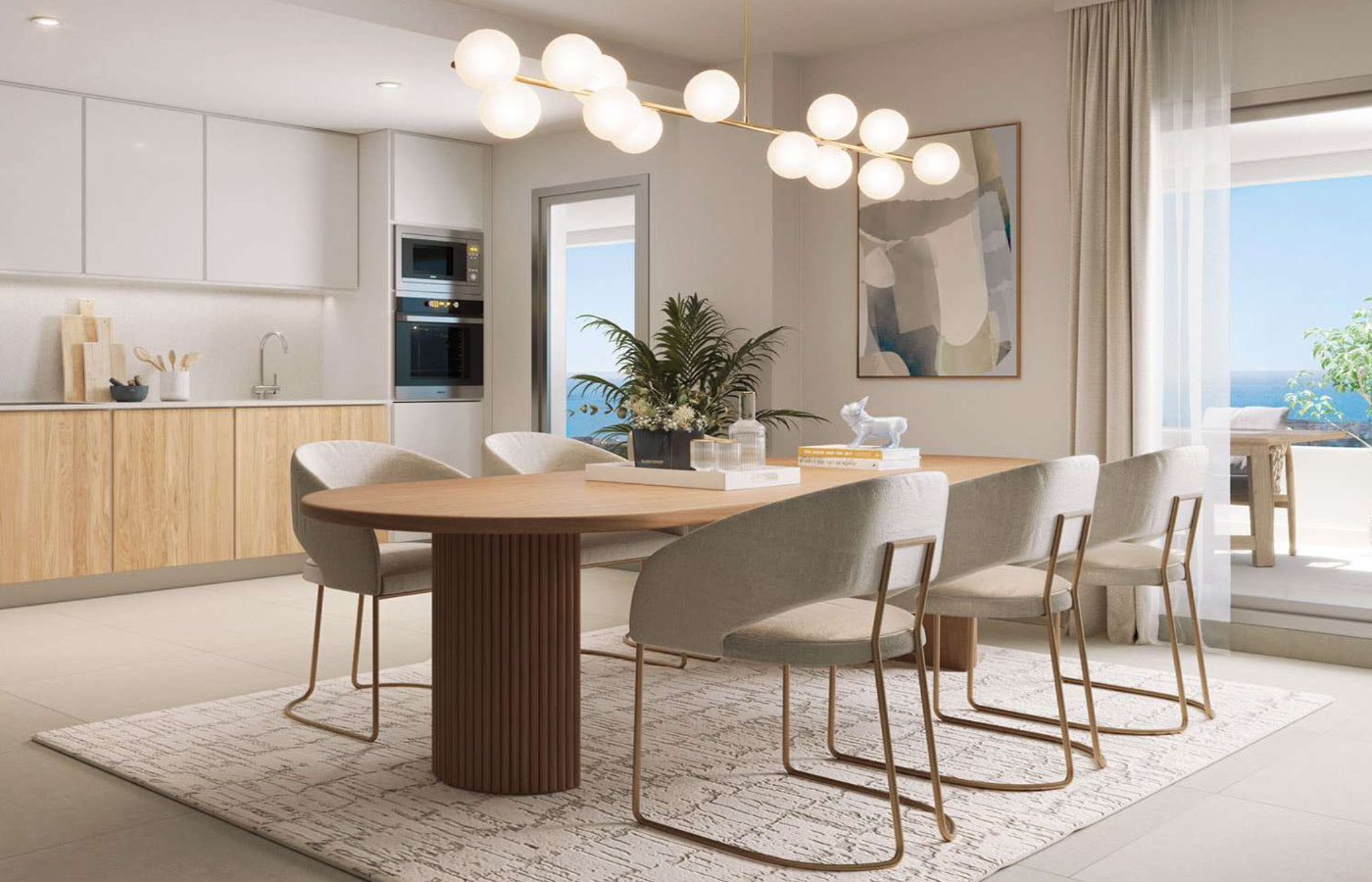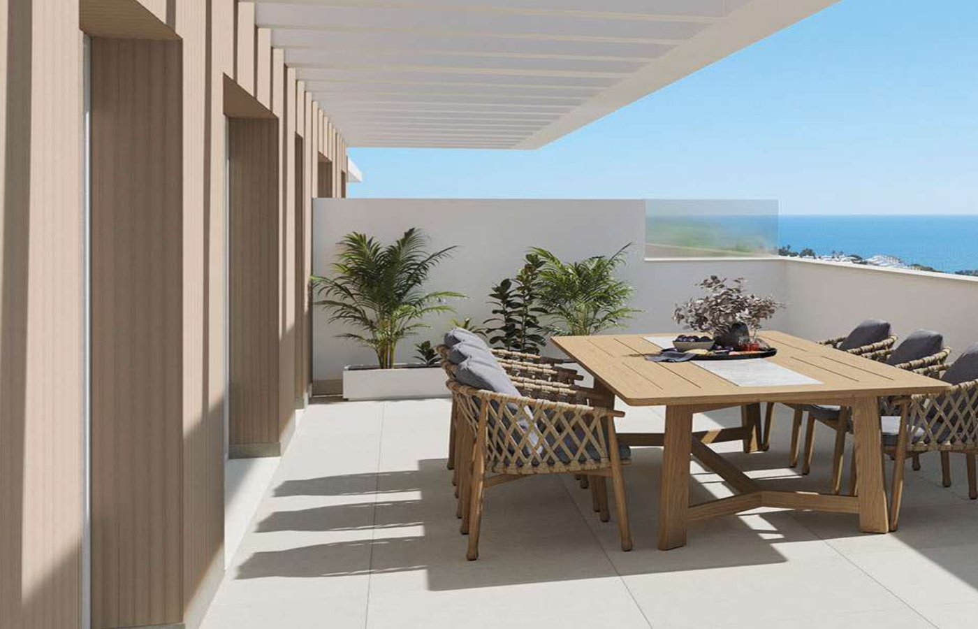 All apartments feature a spacious patio with breathtaking views of the sea, as well as access to communal spaces that include lovely garden areas, swimming pools for summer cooling down, and a fitness center.