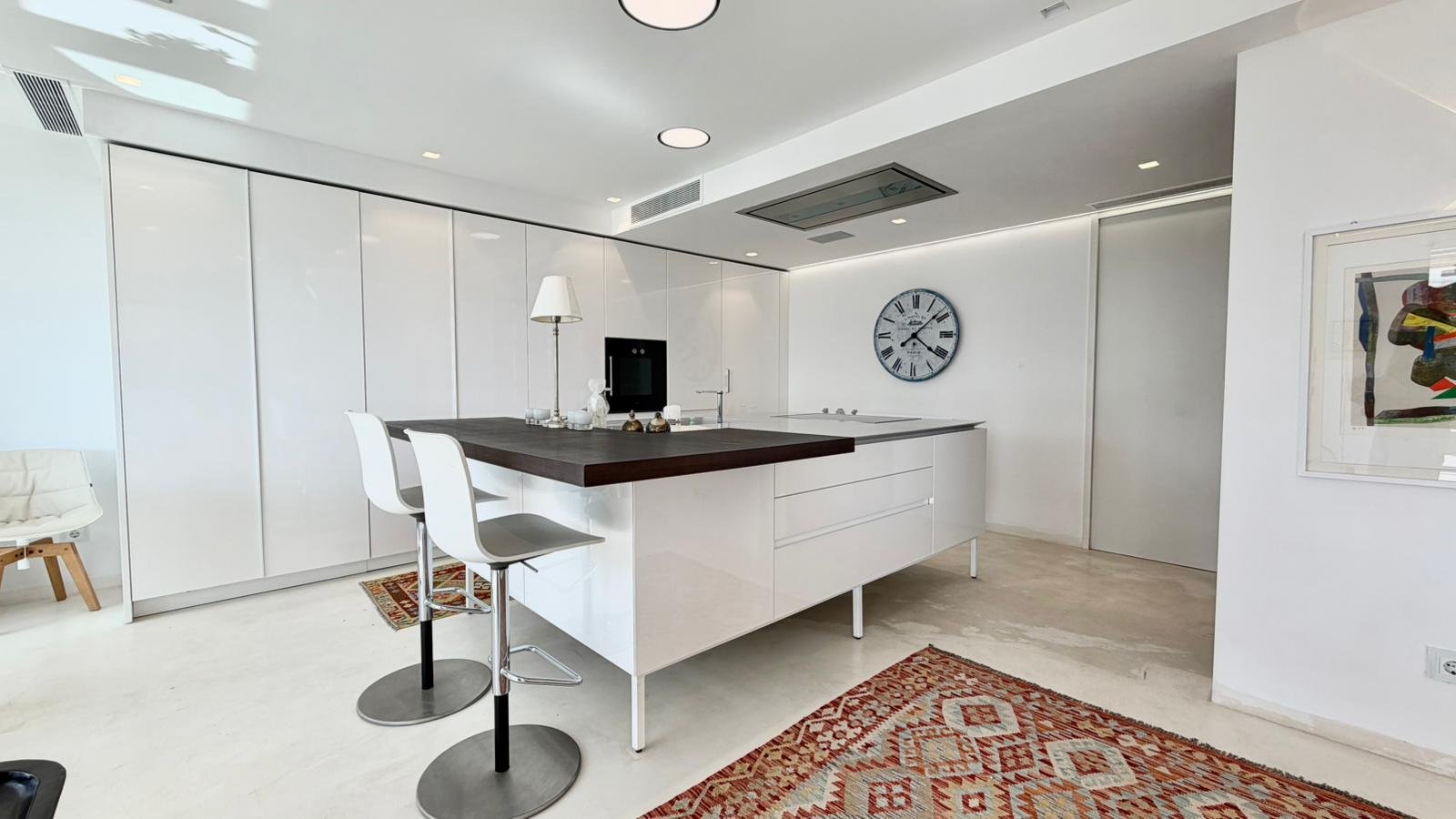 The interior design embraces a modern Scandinavian aesthetic, highlighted by white microcement flooring that enhances the sense of space and light. The open-plan living area seamlessly connects with the terraces, creating an ideal setting for indoor-outdoor living. The property is equipped with state-of-the-art home automation (domotics) and a high-end Guinni & Trettino kitchen, combining elegant design with top functionality.